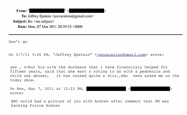 მიმოწერაში ეპშტეინი პირდაპირ ამბობს, რომ 15 წლის განმავლობაში ის იყო ჰერცოგინიას ფარული სპონსორი. ეს ინფორმაცია სრულად ანგრევს ფერგიუსონის ვერსიას, თითქოს მან ეპშტეინისგან მხოლოდ მცირე თანხა ისესხა ვალების დასაფარად. ირკვევა, რომ პედოფილი მილიარდერი ფაქტობრივად „ყიდულობდა“ სამეფო ოჯახთან სიახლოვეს.